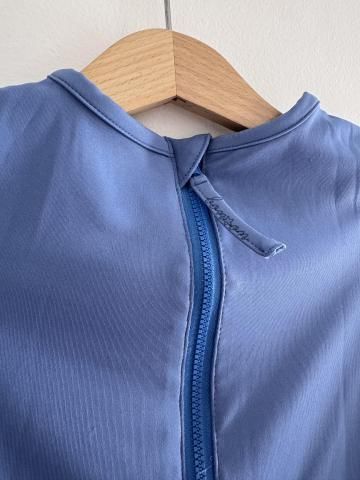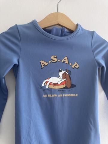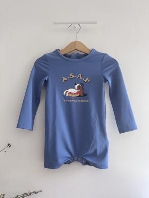 紫外線防止テクニカル キャンバスを使用した「Blue Mediterranean」の スイムスーツは、海辺での日々の理想的なパートナーです。犬の Asap が描かれているだけでなく、「AS Slow as possible」という文字も刻まれており、スタイルと保護機能を兼ね備えています。
