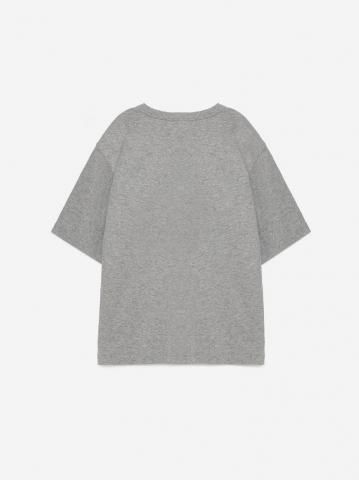 メランジグレーのTシャツ No.05は100%コットン製で、フロントに鳥とロゴがプリントされています。ラウンドネック、半袖、ゆったりとしたフィット感です。ポルトガル製