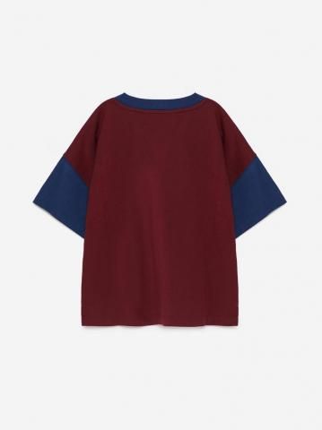 バーガンディレッドのTシャツ18は、100%オーガニックコットン製です。袖と襟はコントラストの効いたブルーで、フロントにはブランドスローガンがプリントされています。レギュラーフィットです。ポルトガル製。