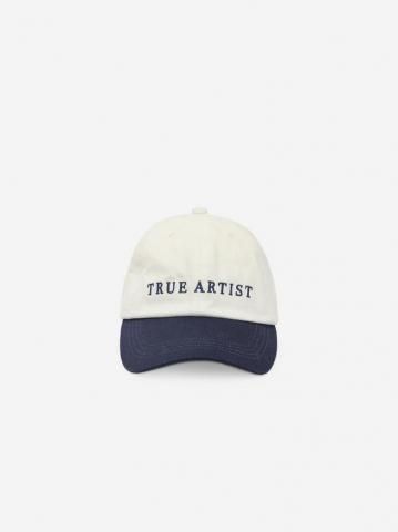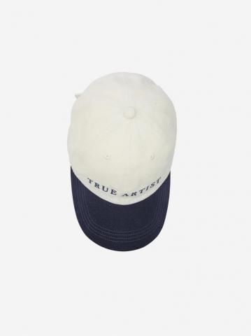 キャップ No.01(ブルーブロック)は100%コットン製です。ネイビーとオフホワイトを組み合わせたカラーブロックキャップで、フロントにはTRUE ARTISTのロゴが刺繍されています。中国製。
