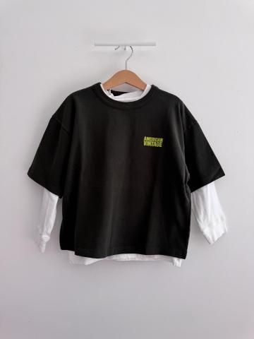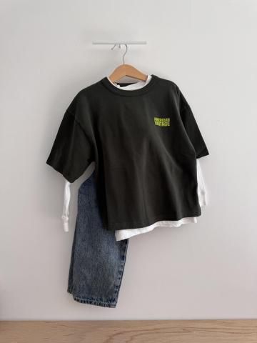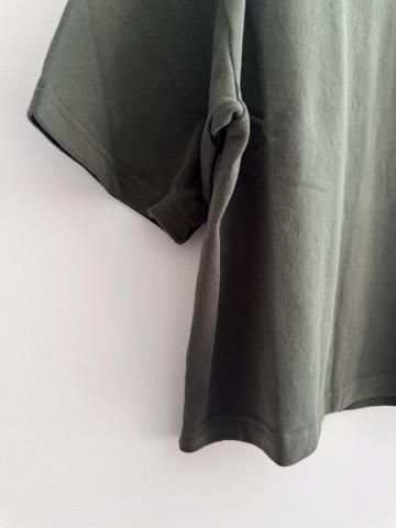 深いカーキの色味のYKOBOWの子供用 T シャツは、シンプルなショート丈の半袖ラウンドネックTシャツ。ふわっとした肌触りとうっすらと起毛感のある裏地で晩夏シーズンから活躍してくれる1枚。
