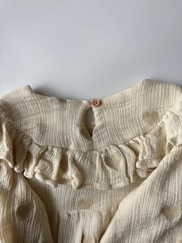 New BarnコレクションのMaddieブラウス。ラッフルとパフスリーブが、素朴な魅力を放ちます。クロスステッチのハートが優しさを添え、伸縮性のある袖口が快適さとスタイルを両立。ダブルコットンガーゼで仕立てられたこのブラウスは、カウガール気分を盛り上げるのにぴったり。ジーンズと合わせれば、シックなウエスタンルックに!
