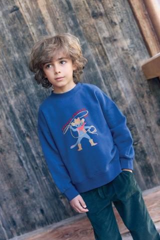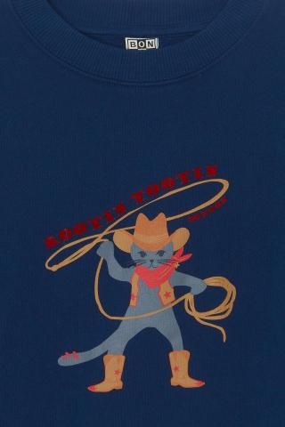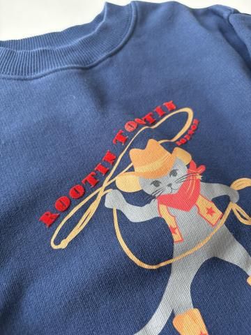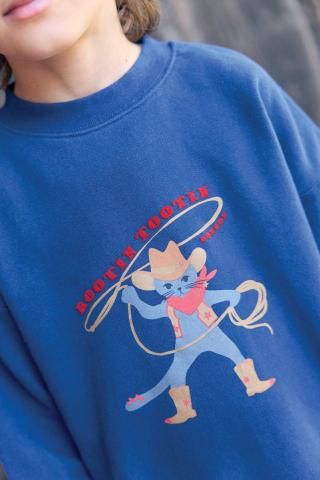 「New Barn」コレクションの「Lame Lasso」スウェットシャツ。大胆不敵なカウボーイキャットがあしらわれたこのローブルーのスウェットシャツは、子供たちを冒険へと誘います。100%コットン素材で、現代の若いカウボーイに快適さとスタイリッシュさをプラス。ジーンズやデニムジャケットと合わせれば、個性あふれる魅力的なウエスタンルックが完成します!裏起毛で暖かく着ていただけます。