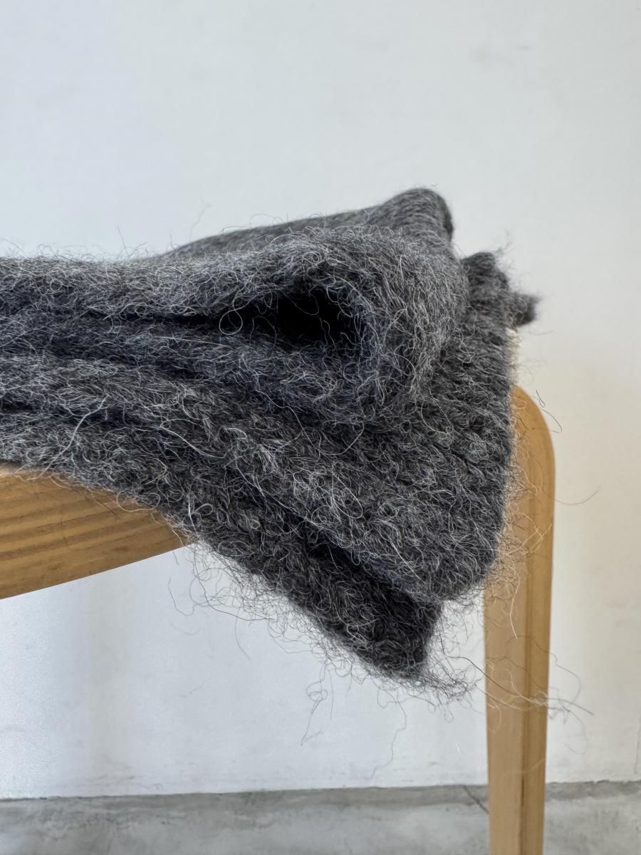 ふわふわとした質感の、無染色のラマウールをリブ編みした、柔らかく厚みのあるスカーフです。クラシックなレギュラーフィットです。